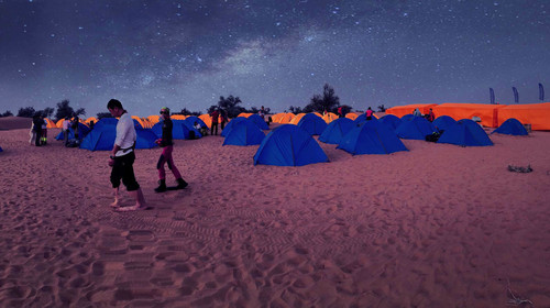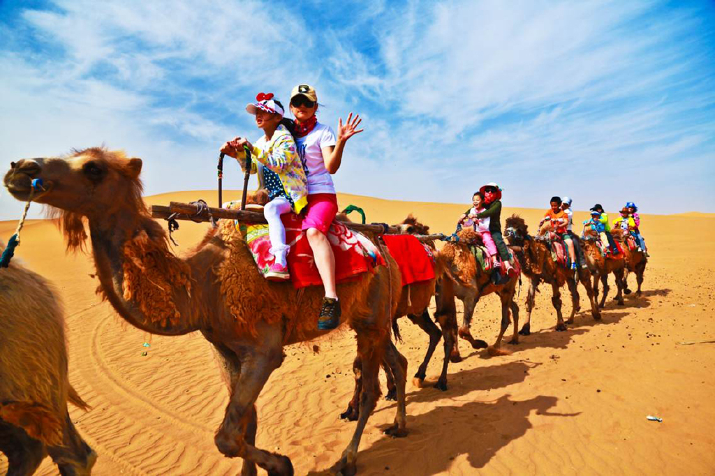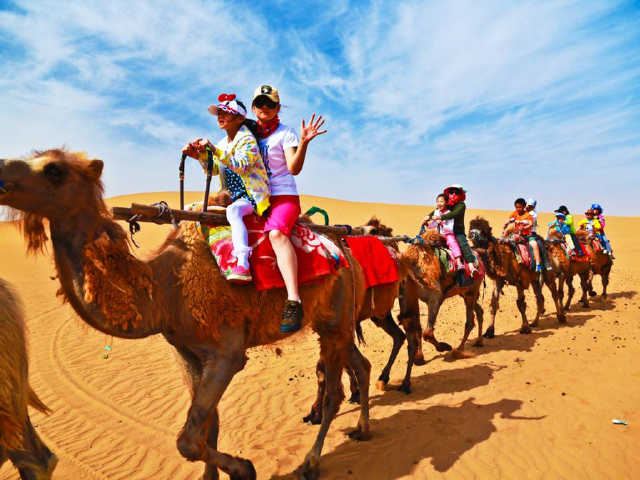坐车抵【腾格里大漠景区】,到达驼场,可自费骑骆驼抵达沙漠营地,举办沙漠专家讲座,感知沙坡头光辉的治沙历史,讲解世界首创—【麦草方格治沙法】,亲自动手扎麦草方格参与治沙活动,为保护地球,保护母亲河、绿化大西北做出自己的贡献。举行【“大漠寻宝”活动】(奖品为沙坡头特色旅游纪念品)在茫茫沙海中寻找宝物。乘坐车前往爸爸去哪儿明星拍摄地参观,试睡明星款帐篷。